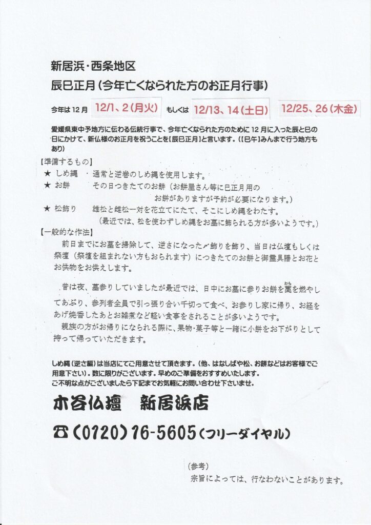 皆さんこんにちは、愛媛 木谷仏壇 新居浜店です。今回は辰巳正月についてです。