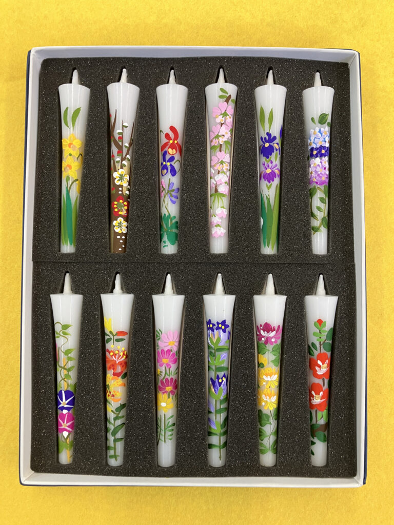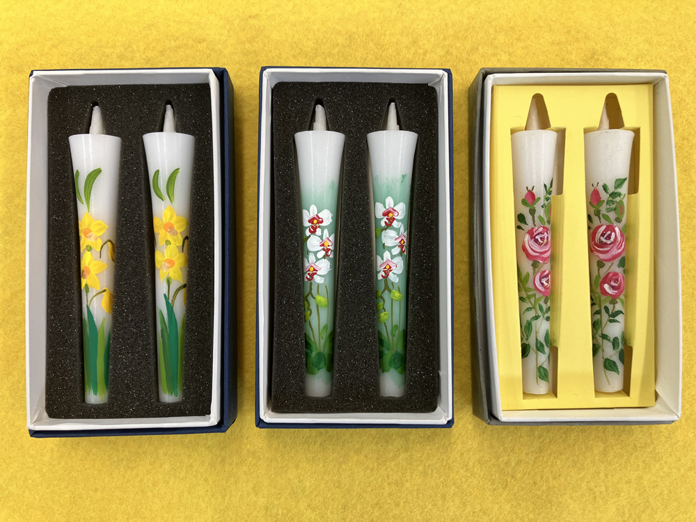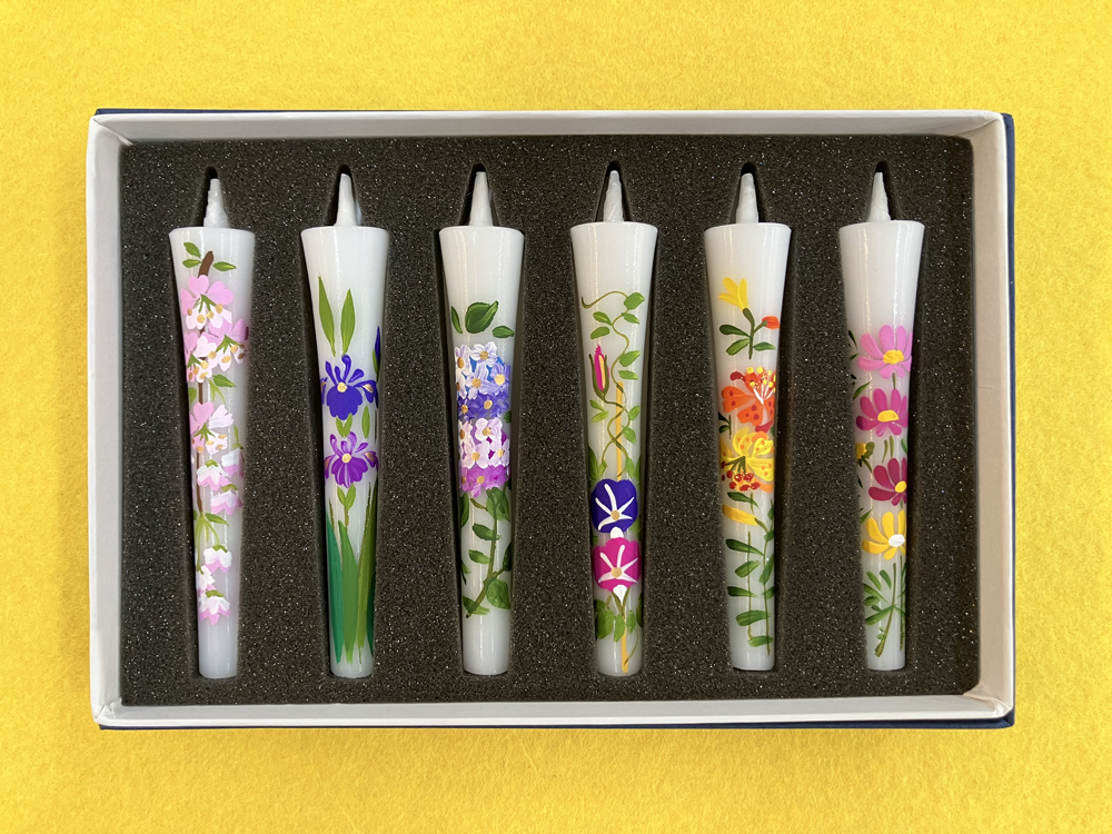 植物性の蝋【もくろう】で作られた和ろうそくに、華やかな花の絵を手描きした伝統工芸品です🕯️