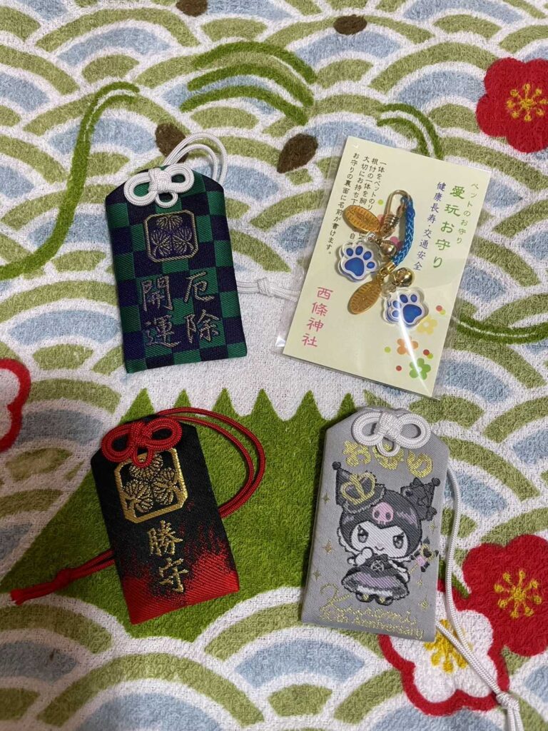 今年はこの4種類にしました。お守りだけじゃなく、土鈴(キティちゃん)やぬいぐるみ(キティちゃん)やご朱印帳(キティちゃん)も販売されてました。