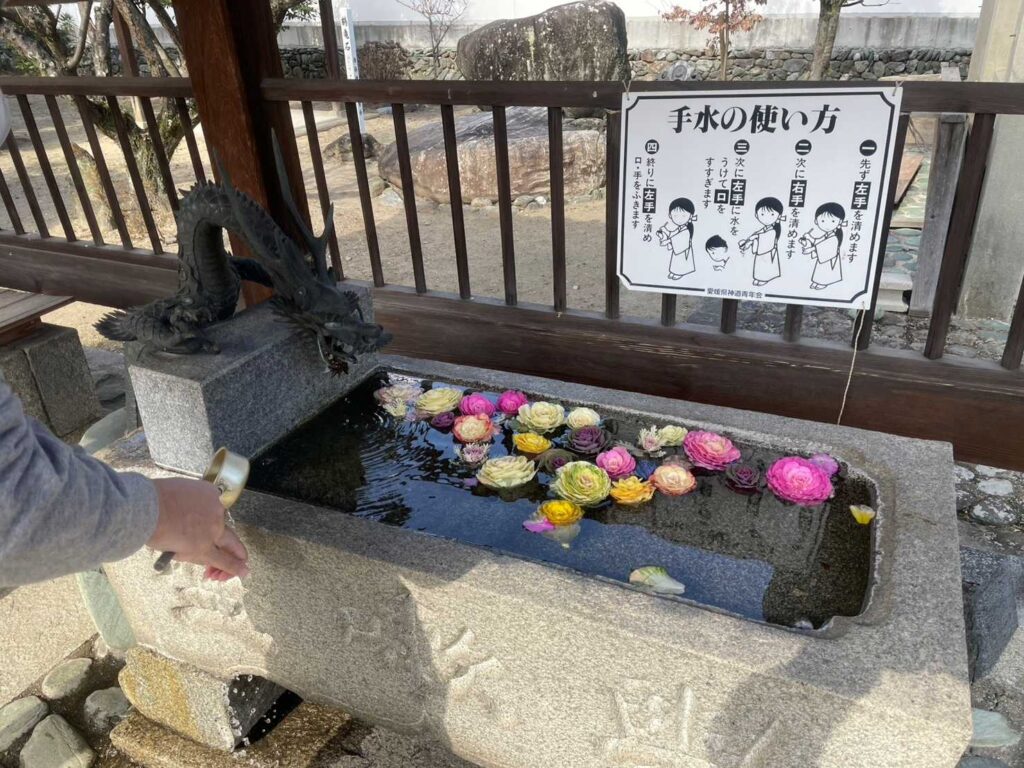 鳥居をくぐると正面に神社、右手に手水鉢があり、かわいいお花が浮いていました。