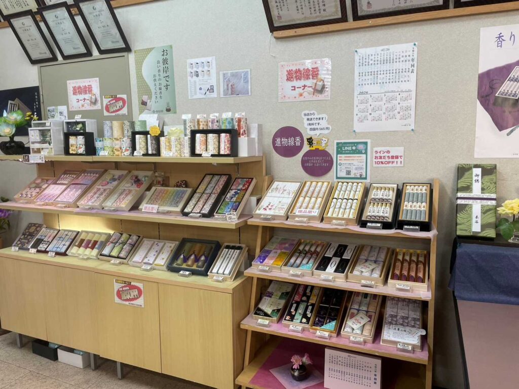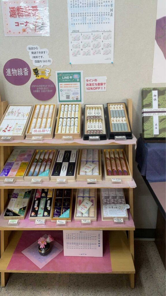 2月も半分が過ぎ、春のお彼岸ももう間もなくですね。新居浜店では、進物用お線香のコーナーを拡大いたしました。