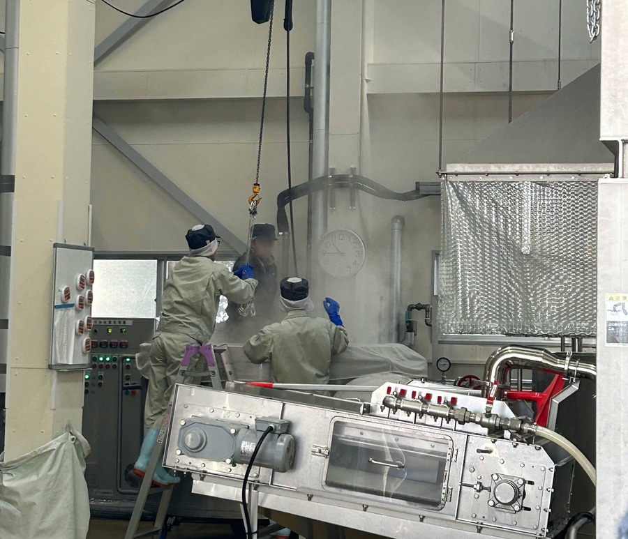 大きな釜で蒸し上がったばかりのお米が持ち上げられ、蒸気とともに運ばれていく様子は圧巻の迫力。