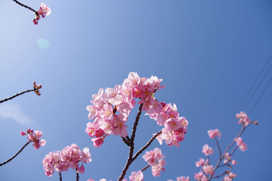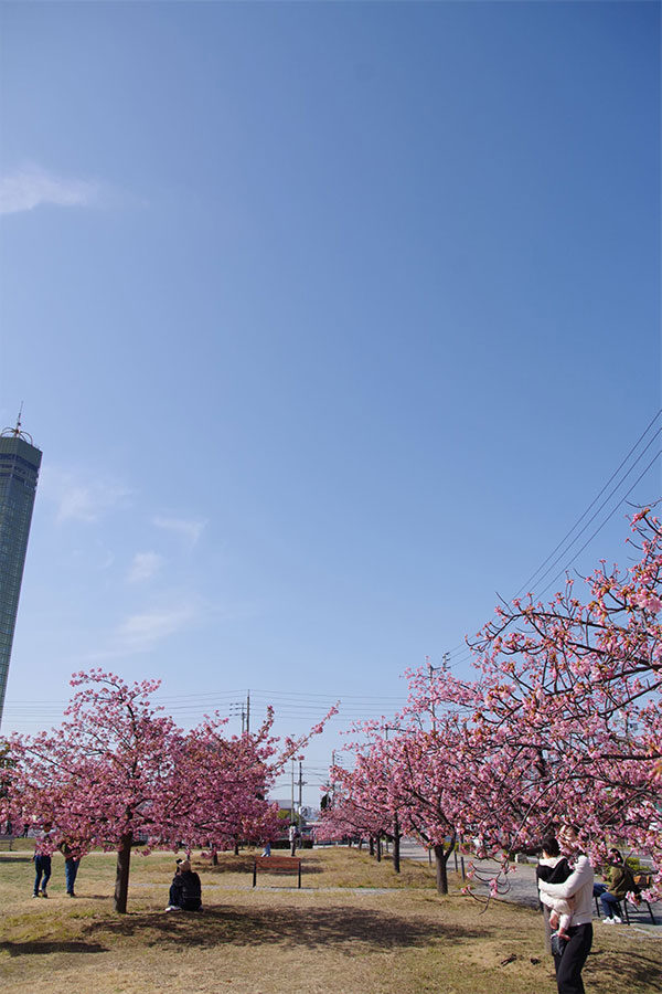 10日前くらいから咲き始めて、昨日は5~6割程度の開花になっていて、青い空とピンク色のコントラストがとても綺麗でした!