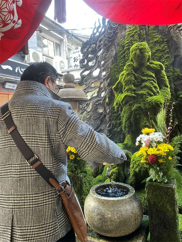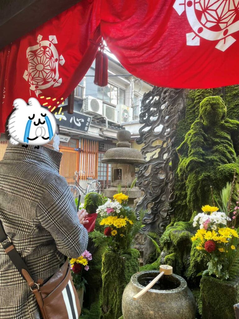 3月の初めに大阪の法善寺様へ行ってきました。このお寺様は1637年に出来たお寺で、火災や戦災を何度も経験してるそうですが、1945年の大阪空襲で町が消失した焼け野原にこのお不動様が残っていたとか。今も、水かけ不動さんとして有名なこのお不動さん、すべての命の源である「水」を全身で受け止めてくださり、願いの数だけ苔が広がりはぐくまれてきたのですね。(写真の右奥の苔まみれのでこぼこしたのが、お不動様です!!)