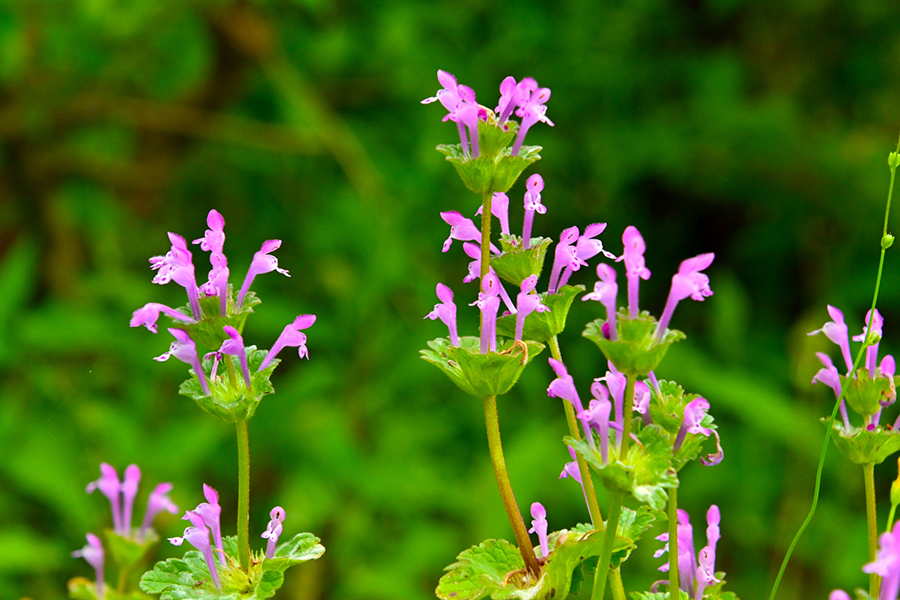 葉っぱを台座、お花を仏像に見立てて名づけられたホトケノザ。